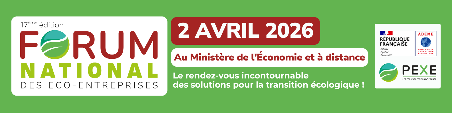 Le Forum national des éco-entreprises organisé par le PEXE - Les éco-entreprises de France et l'ADEME revient pour une 17ème édition le 2 AVRIL 2026 au Ministère de l’Économie et à distance !